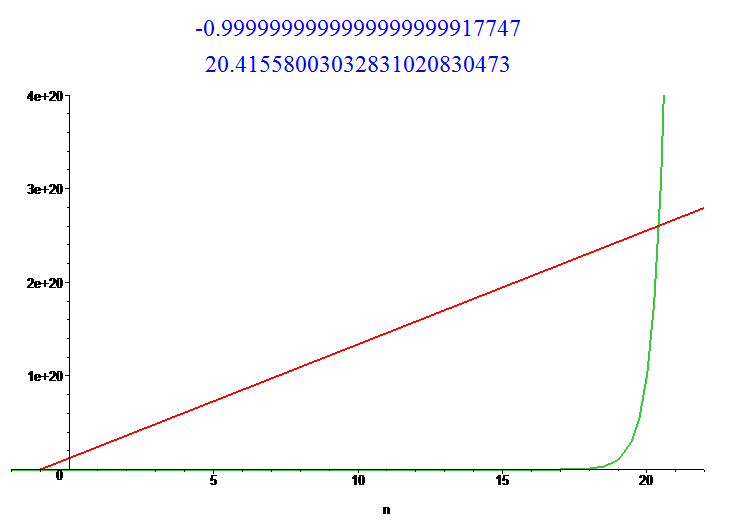 The equation  9^20*(n+1)=10^n  has not more than 2 roots as the intersection of a straight line with a convex curve. Find these roots and the plot (for clarity) :