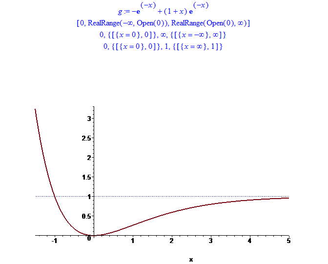 We can see (and the plot confirms) that the function  f  is strictly decreasing in the domain  RealRange(-infinity,0) and takes all the values from  RealRange(0,infinity)  and  f  is strictly increasing in the domain  RealRange(0,infinity) and takes all the values from  RealRange(0, Open(1))