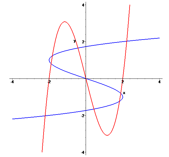 plots[implicitplot]([x^3-4*x=y, y^3-3*y=x], x=-4..4, y=-4..4, color=[red,blue], thickness=2, gridrefine=3);