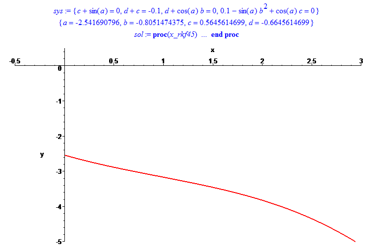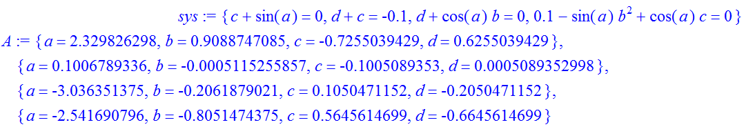 sys := {c+sin(a) = 0, d+c = -0.1, d+cos(a)*b = 0, 0.1-sin(a)*b^2+cos(a)*c = 0};