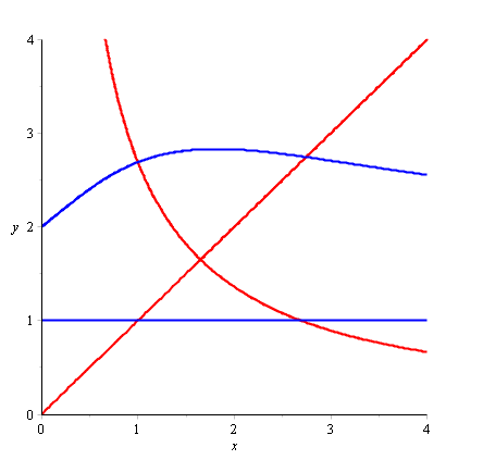 plots[implicitplot](sys, x = 0 .. 4, y = 0 .. 4, color = [red, blue], thickness = 2, gridrefine = 3);