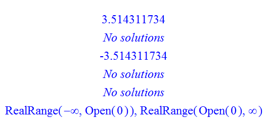 if b=0 then if a=0 then return RealRange(-infinity,Open(0)), RealRange(Open(0),infinity) else return `No solutions` fi; fi;