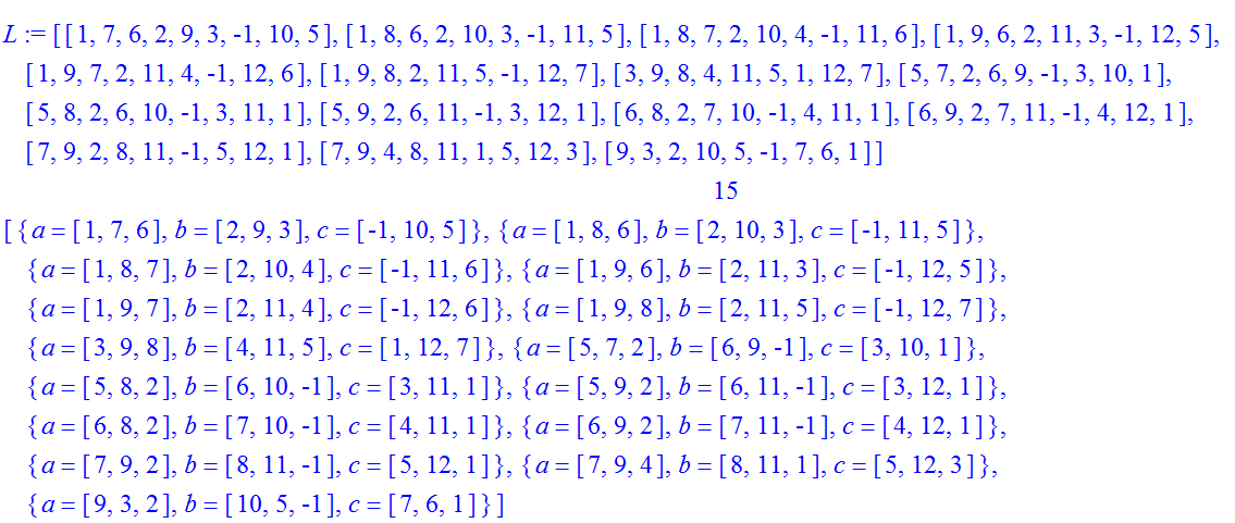 L:=select(t->`*`(op(t))<>0 and nops(convert(t, set))=9, [seq(seq(seq([x, y, z, 1+x, 2+y, -3+z,-2+x, 3+y, -1+z ], z=1..9), y=1..9), x=1..9)]);