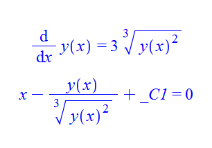 de := diff(y(x), x) = 3*surd(y(x)^2, 3);