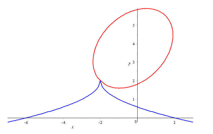 plots[implicitplot]([sqrt((x-1)^2+(y-5)^2)+(1/2)*abs(x+y) = 3*sqrt(2), sqrt(abs(x+2)) = 2-y], x = -7 .. 3, y = -3 .. 6, color = [red, blue], thickness = 2, numpoints = 10000, scaling = constrained);