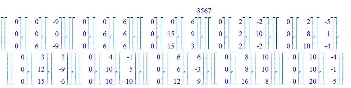 if (T[1]<>0 or T[2]<>0 or T[3]<>0) then if (CC[1]::integer and CC[2]::integer and CC[3]::integer) and (Oc[1]::integer and Oc[2]::integer and Oc[3]::integer) and (Ct[1]::integer and Ct[2]::integer and Ct[3]::integer) then k:=k+1: L[k]:=[A,B,C]: fi: fi: