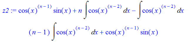 z2 := cos(x)^(n-1)*sin(x)+n*(Int(cos(x)^(n-2), x))-(Int(cos(x)^(n-2), x));