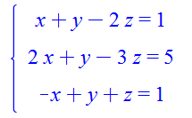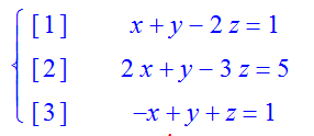 braces([x+y-2*z=1, 2*x+y-3*z=5, -x+y+z=1]);