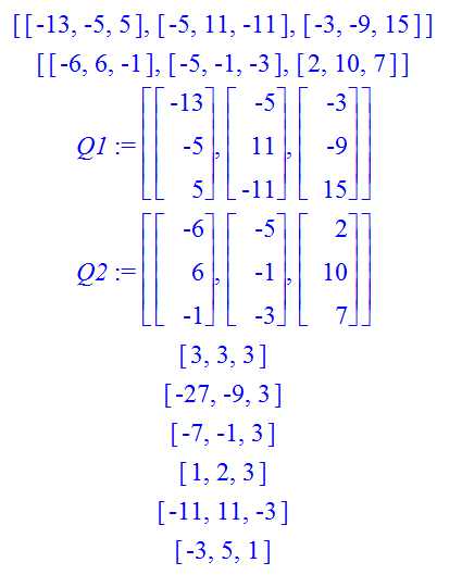 P1:=[[-13,-5,5], [-5,11,-11], [-3,-9,15]]:  P2:=[[-6,6,-1],[-5,-1,-3],[2,10,7]]: