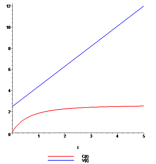 plot([f1, f2], t=0..5, color=[red, blue], thickness=2, legend=['C'(t), 'V'(t)]);