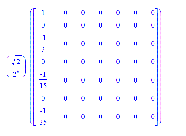 ``(sqrt(2)/2^k)*``(Matrix(N, {seq((m,1)=`if`(m::even,0,-1/m/(m-2)), m=1..N)}));