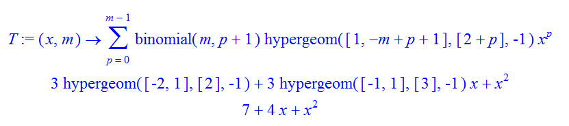 T:=(x,m)->sum( sum(binomial(m,k+p),k=1..m-p)*x^p,p=0..m-1);