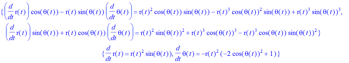 Sys1 := {diff(r(t),t) = r(t)^2*sin(theta(t)), diff(theta(t),t) = -r(t)^2*(-2*cos(theta(t))^2+1)}