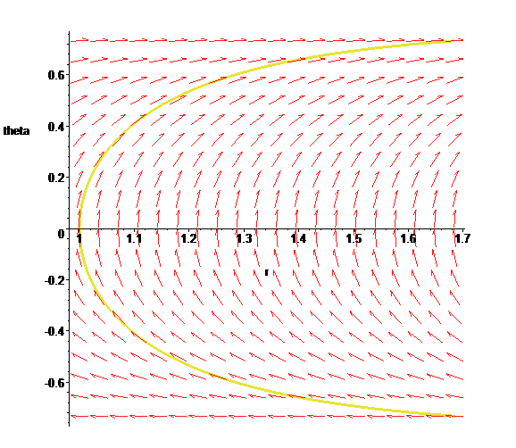 DEtools[phaseportrait](Sys1, [r(t),theta(t)],t=-1..1,[[r(0)=1,theta(0)=0]]);