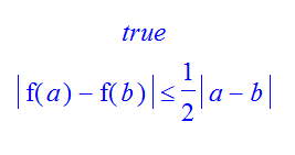 abs('f'(a)-'f'(b))<=maximize(abs(diff(f(x),x)), x=1..2)*abs(a-b);  # Checking of second condition
