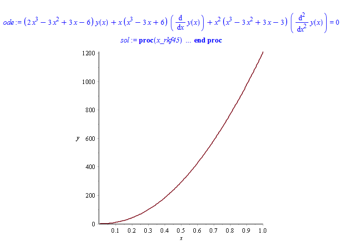 ode := (-6 + 3*x - 3*x^2 + 2*x^3)*y(x) + x*(6 - 3*x + x^3)*diff(y(x),x) + x^2*(-3 + 3*x - 3*x^2 + x^3)*diff(y(x),x$2)= 0;