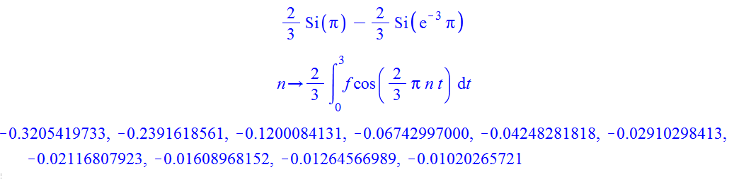 A := n->(2/3)*(int(f*cos((2/3)*Pi*n*t), t = 0..3));