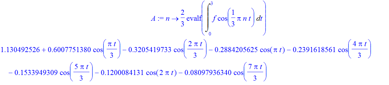 A := n->(2/3)*evalf(Int(f*cos((1/3)*Pi*n*t), t = 0..3));