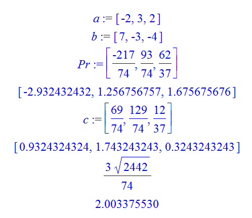 a:=<-2|3|2>;  b:=<7|-3|-4>;