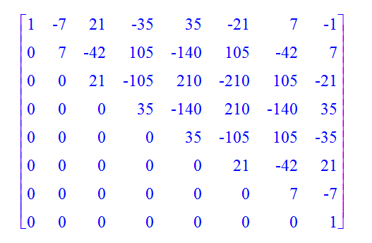 Matrix([seq([0 $ i, seq((-1)^k*binomial(m,i)*binomial(m-i,k), k=0..m-i)], i=0..m)]);