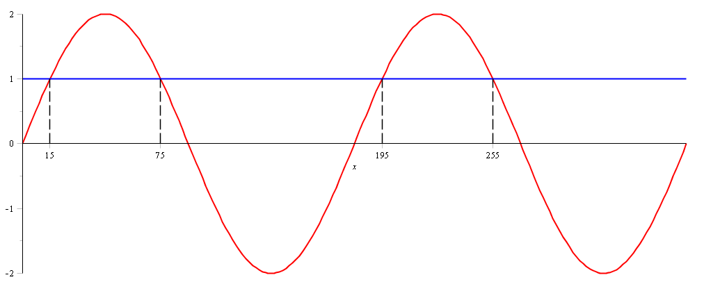 solve({2*sin(2*((1/180)*x*Pi)) = 1, x >= 0, x <= 360}, AllSolutions, Explicit);