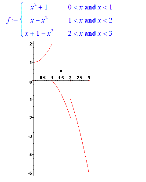 f:=piecewise(x>0 and x<1,x^2+1, x>1 and x<2,x-x^2, x>2 and x<3,x+1-x^2);