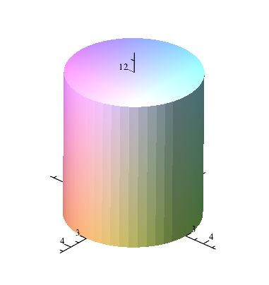plot3d([r*cos(phi), r*sin(phi), 12], phi = 0 .. 2*Pi, r = 0 .. 3, filled = true, axes = normal, style = surface, view = [-4.7 .. 4.7, -4.7 .. 4.7, -2.7 .. 13.7], lightmodel = light4);