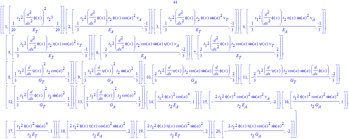 (1/20)*t[1]^2*(diff(diff(phi(x), x), x))^2*t[2]^3/E[T]+t[1]^2*phi(x)^2*cos(a)^2*sin(a)^2/(t[2]*G[A])+t[1]^2*eta(x)^2*cos(a)^2*sin(a)^2/(t[2]*G[A])+(1/3)*t[1]^2*(diff(psi(x), x))^2*t[2]*cos(a)^2/G[T]+(1/3)*t[1]^2*(diff(psi(x), x))^2*t[2]*sin(a)^2/G[A]+(1/3)*t[1]^2*(diff(phi(x), x))^2*t[2]*sin(a)^2/G[T]+(1/3)*t[1]^2*(diff(phi(x), x))^2*t[2]*cos(a)^2/G[A]+t[1]^2*phi(x)^2*cos(a)^4/(t[2]*E[A])+t[1]^2*phi(x)^2*sin(a)^4/(t[2]*E[T])+t[1]^2*eta(x)^2*sin(a)^4/(t[2]*E[A])+t[1]^2*eta(x)^2*cos(a)^4/(t[2]*E[T])+4*t[1]^2*eta(x)*cos(a)*sin(a)^3*psi(x)*nu[A]/(t[2]*E[A])-4*t[1]^2*eta(x)*cos(a)^3*sin(a)*psi(x)*nu[A]/(t[2]*E[A])+8*t[1]^2*psi(x)^2*cos(a)^2*sin(a)^2*nu[A]/(t[2]*E[A])-2*t[1]^2*eta(x)^2*cos(a)^2*sin(a)^2*nu[A]/(t[2]*E[A])+4*t[1]^2*eta(x)*cos(a)*sin(a)^3*psi(x)/(t[2]*E[A])-2*t[1]^2*eta(x)*cos(a)*sin(a)^3*psi(x)/(t[2]*G[A])-4*t[1]^2*eta(x)*cos(a)^3*sin(a)*psi(x)/(t[2]*E[T])+2*t[1]^2*eta(x)*cos(a)^3*sin(a)*psi(x)/(t[2]*G[A])-2*t[1]^2*phi(x)^2*cos(a)^2*sin(a)^2*nu[A]/(t[2]*E[A])+2*t[1]^2*phi(x)*eta(x)*cos(a)^2*sin(a)^2/(t[2]*E[A])+2*t[1]^2*phi(x)*eta(x)*cos(a)^2*sin(a)^2/(t[2]*E[T])-2*t[1]^2*phi(x)*eta(x)*cos(a)^2*sin(a)^2/(t[2]*G[A])-2*t[1]^2*phi(x)*eta(x)*nu[A]*sin(a)^4/(t[2]*E[A])-2*t[1]^2*phi(x)*eta(x)*nu[A]*cos(a)^4/(t[2]*E[A])+4*t[1]^2*phi(x)*cos(a)^3*sin(a)*psi(x)/(t[2]*E[A])-2*t[1]^2*phi(x)*cos(a)^3*sin(a)*psi(x)/(t[2]*G[A])-4*t[1]^2*phi(x)*cos(a)*sin(a)^3*psi(x)/(t[2]*E[T])+2*t[1]^2*phi(x)*cos(a)*sin(a)^3*psi(x)/(t[2]*G[A])+(2/3)*t[1]^2*(diff(psi(x), x))*t[2]*cos(a)*sin(a)*(diff(phi(x), x))/G[A]-(2/3)*t[1]^2*(diff(psi(x), x))*t[2]*cos(a)*sin(a)*(diff(phi(x), x))/G[T]-(1/3)*t[1]^2*(diff(diff(phi(x), x), x))*t[2]*phi(x)*cos(a)^2*nu[A]/E[A]-(1/3)*t[1]^2*(diff(diff(phi(x), x), x))*t[2]*phi(x)*sin(a)^2*nu[T]/E[T]-(1/3)*t[1]^2*(diff(diff(phi(x), x), x))*t[2]*eta(x)*sin(a)^2*nu[A]/E[A]-(1/3)*t[1]^2*(diff(diff(phi(x), x), x))*t[2]*eta(x)*cos(a)^2*nu[T]/E[T]+4*t[1]^2*psi(x)^2*cos(a)^2*sin(a)^2/(t[2]*E[A])+4*t[1]^2*psi(x)^2*cos(a)^2*sin(a)^2/(t[2]*E[T])-2*t[1]^2*psi(x)^2*cos(a)^2*sin(a)^2/(t[2]*G[A])+4*t[1]^2*phi(x)*cos(a)^3*sin(a)*psi(x)*nu[A]/(t[2]*E[A])-4*t[1]^2*phi(x)*cos(a)*sin(a)^3*psi(x)*nu[A]/(t[2]*E[A])+(2/3)*t[1]^2*(diff(diff(phi(x), x), x))*t[2]*cos(a)*sin(a)*psi(x)*nu[T]/E[T]-(2/3)*t[1]^2*(diff(diff(phi(x), x), x))*t[2]*cos(a)*sin(a)*psi(x)*nu[A]/E[A]+t[1]^2*psi(x)^2*sin(a)^4/(t[2]*G[A])+t[1]^2*psi(x)^2*cos(a)^4/(t[2]*G[A])