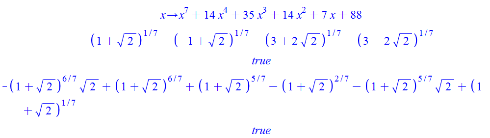 x0 := (1+sqrt(2))^(1/7)-(-1+sqrt(2))^(1/7)-(3+2*sqrt(2))^(1/7)-(3-2*sqrt(2))^(1/7);