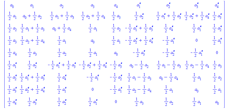 SpecialMatrix([seq(a[i], i = 0 .. 4), seq(a[i]^`&lowast;`, i = 1 .. 4)]);