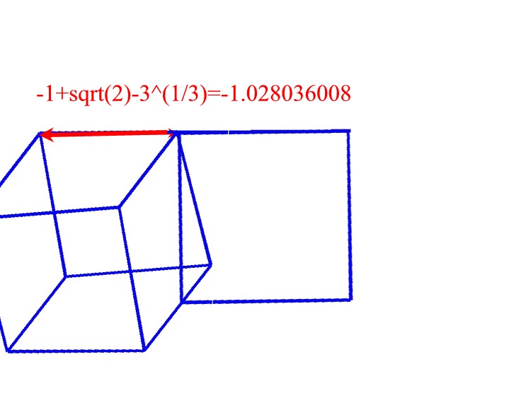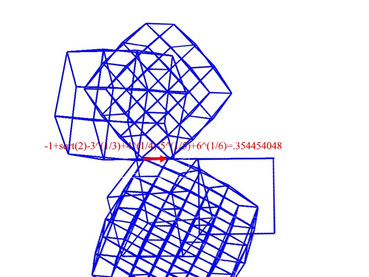 The following mess is a two dimensional projection of the segment, square, cube, tesseract, penteract and hexeract lined up not quite according to Diagram 3. The red segment should  represent 1-sqrt(2)+3^(1/3)+4^(1/4)-5^(1/5)+6^(1/6), but I'm not sure if I kept track of its possition altogether correctly.Furthermore, it is not necessarily to scale.
