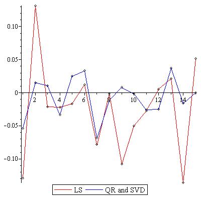 LineChart([data1, data2], color = [red, blue], legend = ["LS", "QR and SVD"])