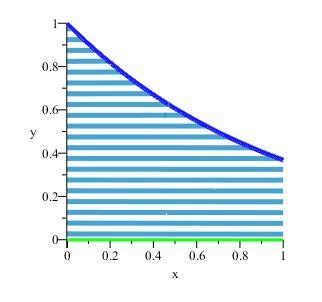 SurfaceOfRevolution(exp(-x), x = 0 .. 2, view = [0 .. 1, 0 .. 1, 0 .. 1], 'axis' = 'horizontal', thickness = 3, orientation = [0, 90, 90], 'distancefromaxis' = 0, 'output' = 'plot', labels = ["x", "", "y"], transparency = .1, title = "", surfaceoptions = [colour = COLOR(RGB, .2, .6, .8), style = contour, contours = 20, thickness = 5]);