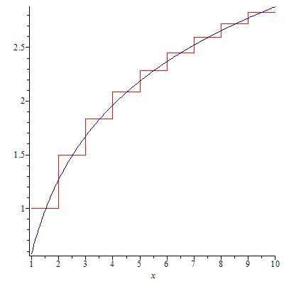 plots:-display([theHarmonicNumbersPlotWithSteps,theLogApproximationPlot]);