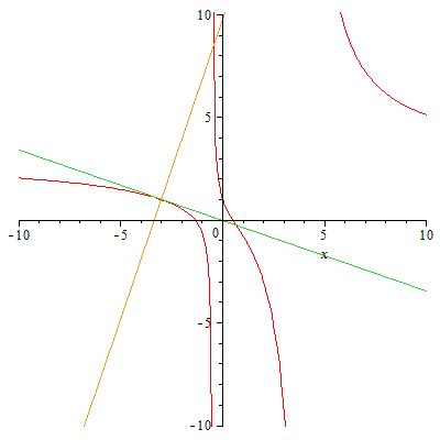 I think what you mean is f(x) = (6*x^2+5*x-4)/(2*x^2-7*x-4). Since you used Tangent(f(x),x=-3), you probably want the tangent at (-3,1), not (0,1).