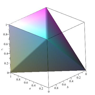 plot3d([min(b+c,1),b,c],b=0..1,c=0..1)],