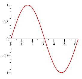 plots[spacecurve]([t,sin(t),0],t=0..2*Pi,colour=red,orientation=[-90,0,0],axes=normal,view=[0..2*Pi,-1..1,-1..1]);
