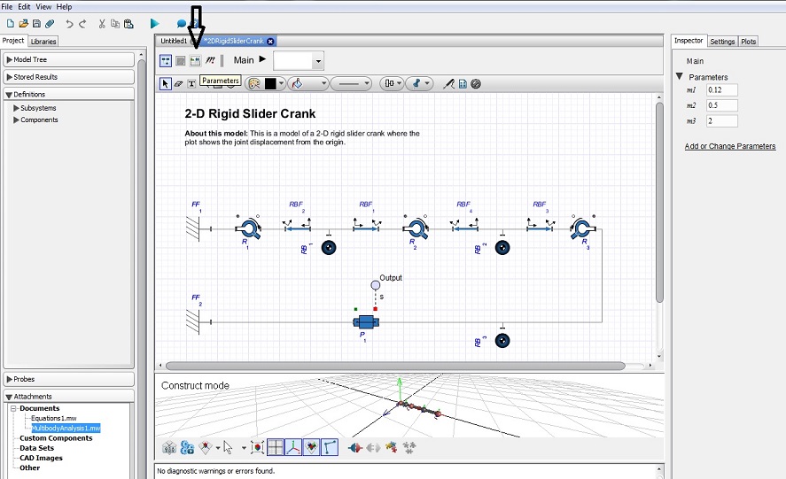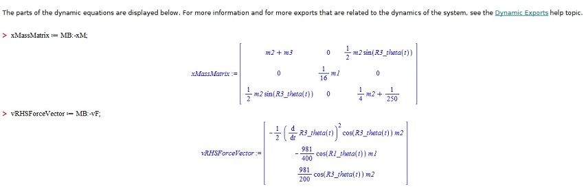 So, first, define the mass values as parameters see picture 1 where to do this and replace the numerical values for the masses. Then start the multibody analysis template a replace the colon (which suppresses output) at the end of a command by a semicolon. result should look like pic 2.