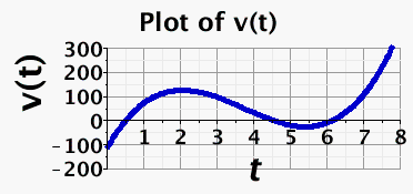 restart; with(plots); s := proc (t) options operator, arrow; 2*t^4-30*t^3+135*t^2-120*t-10 end proc; diff(s(t), t); v := proc (t) options operator, arrow; diff(s(t), t) end proc; p1 := plot(s(t), t = 0 .. 8, 'gridlines', 'color' = "red", 'title' = "Plot of s(t)", background = "Azure", size = [1700, 800], axesfont = [Helvetica, bold, 14], view = [default, -100 .. 500], titlefont = [Helvetica, bold, 18], labelfont = [Helvetica, bold, 24], axis[1] = [location = low], thickness = 4, annotation = typeset("t =", ('xcoordinate')(digits = 6), " ", "  s(t)= ", ('ycoordinate')(digits = 6), " "), labels = [t, "s(t)"], labeldirections = [Horizontal, Vertical]); p2 := plot(v(t), t = 0 .. 8, 'gridlines', 'color' = "blue", 'title' = "Plot of v(t)", background = "Azure", size = [1700, 800], axesfont = [Helvetica, bold, 14], view = [default, -200 .. 300], titlefont = [Helvetica, bold, 18], labelfont = [Helvetica, bold, 24], axis[1] = [location = low], thickness = 5, annotation = typeset("t =", ('xcoordinate')(digits = 6), " ", "  v(t)= ", ('ycoordinate')(digits = 6), " "), labels = [t, "v(t)"], labeldirections = [Horizontal, Vertical]); plots:-display(Array([p1, p2]))