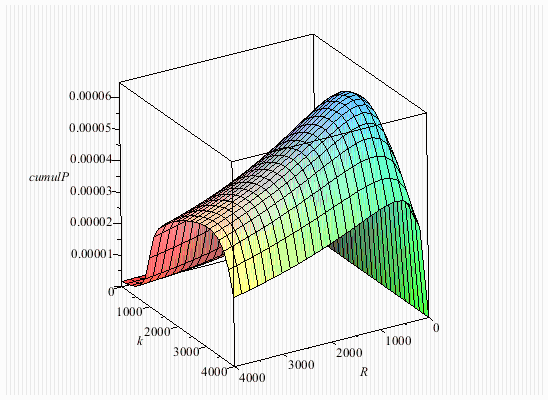 plot3d(G, 0 .. 4000, 0 .. 4000, axes = box, labels = [R, k, cumulP])