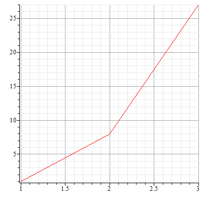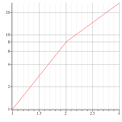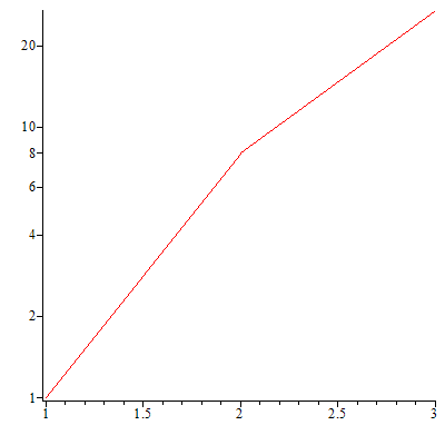 plots:-display(plots:-logplot([[1, 1], [2, 8], [3, 27]]));
