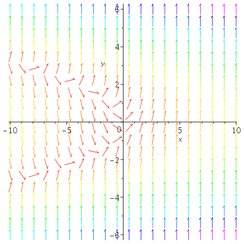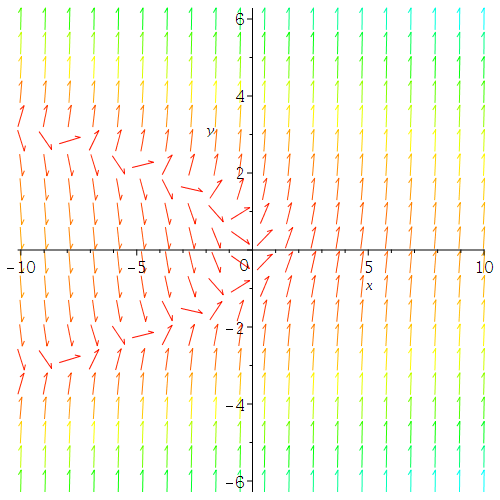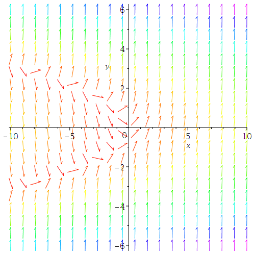 plots:-fieldplot([1, y^2 + x], x = -10 .. 10, y = -6 .. 6,