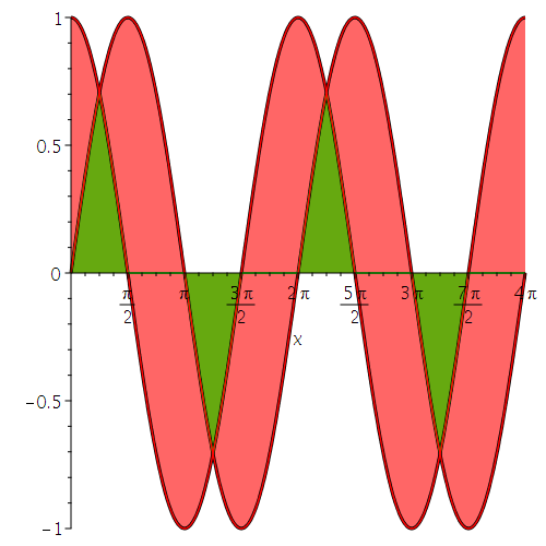 b := plot(f, 0..4*Pi, filled=true, color=green):