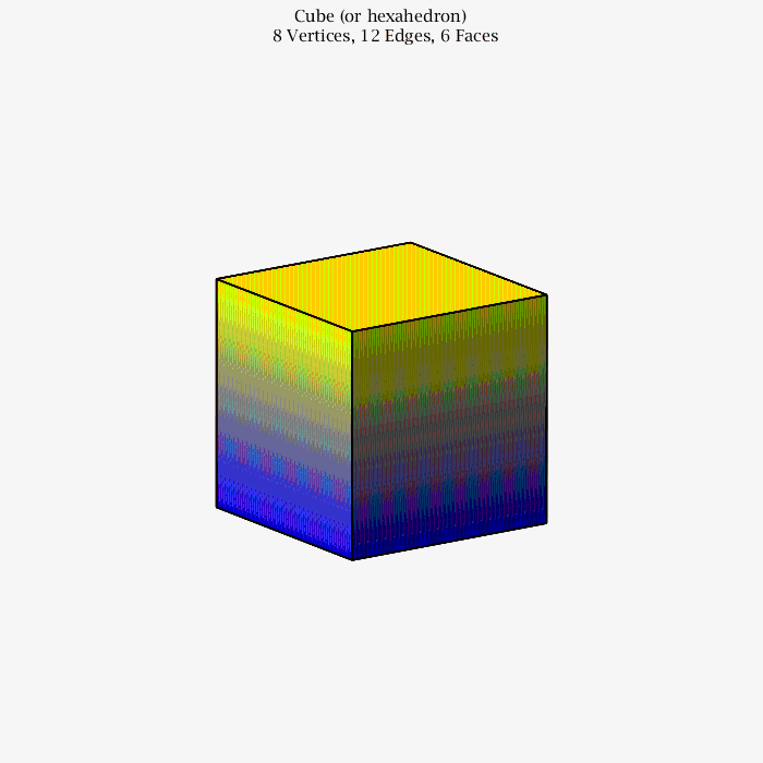 p1 := display(draw(cube(f, point(o, 0, 0, 0))), title = "Cube (or hexahedron) \n 8 Vertices, 12 Edges, 6 Faces")