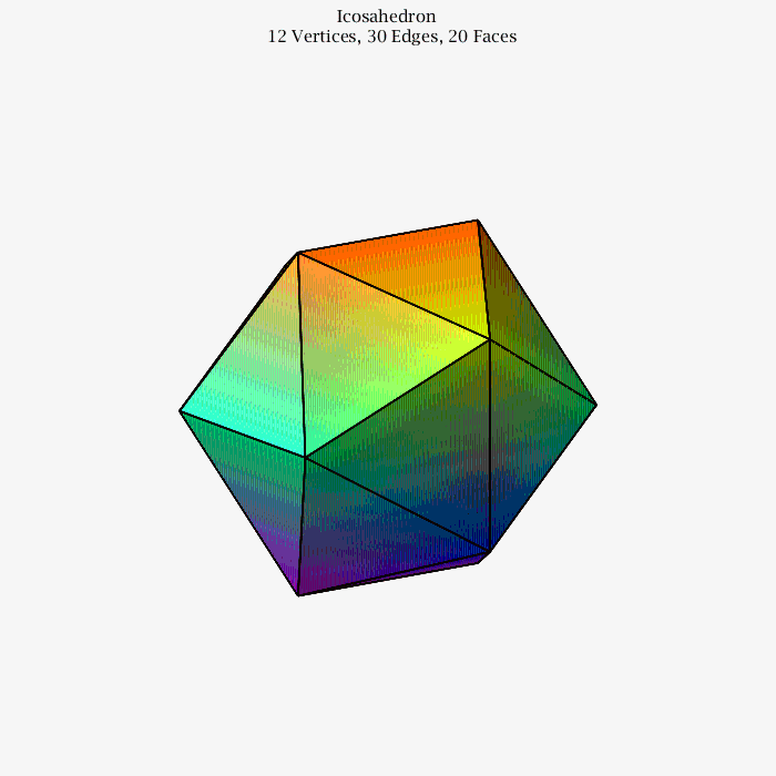 p4 := display(draw(icosahedron(f, point(o, 0, 0, 0))), title = "Icosahedron \n 12 Vertices, 30 Edges, 20 Faces")