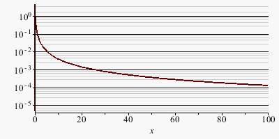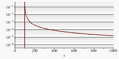 plot(PDF(X,x), x=0..100, axis[2]=[mode=log], size=[400,200]);