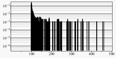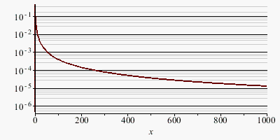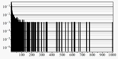plot(PDF(X,x), x=0..1000, axis[2]=[mode=log], size=[400,200]);