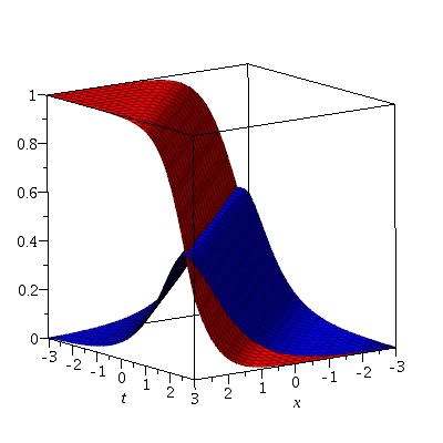 plot3d(([Re, Im])(u(x, t)), x = -3 .. 3, t = -3 .. 3, color = [red, blue])