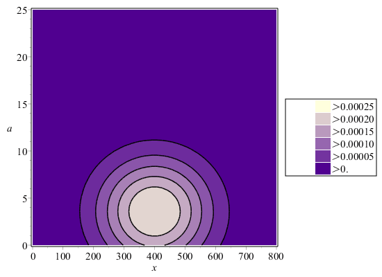 plots:-contourplot(expr, x=0..800, a=0..25, filledregions,