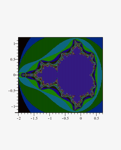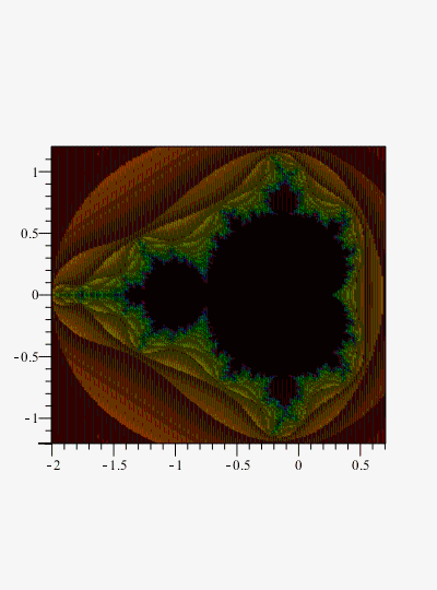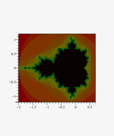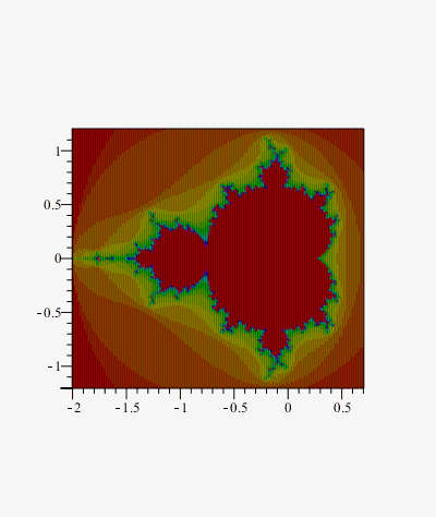 Note that I have made no special effort here for efficiency. In particular the 2-value-return version mandelbrot2 below is not evalhf'able and so is slow. It could be made faster.